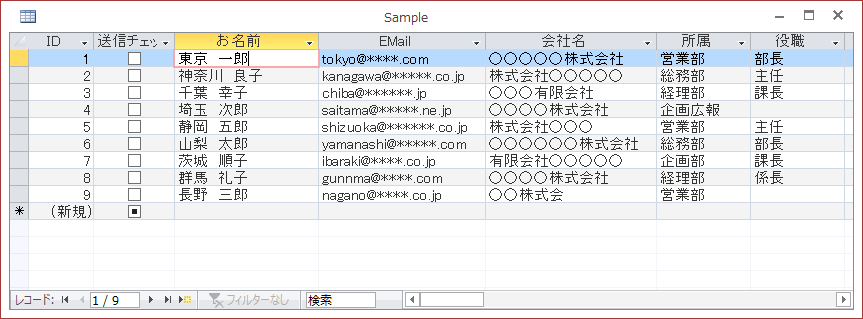 もし、設定したACCDBファイルのテーブルに、必須フィールドに合ったフィールドがない場合は、「フィールド無」を選択してください。 フィールド無に設定されたものは、自動的にフィールドが生成されます。 データ型が合わない場合、例えば、IDにオートナンバー型でないフィールドを設定すると、次のようなメッセージが出ます。 ![]() このようなときは、データ型が合ったフィールドを選んでください。 もしなければフィールド設定で新たに作るか、フィールド無を選んでください。 注意 ACCDBファイルは、ひとつのテーブルにオートナンバー型のフィールドは1つしか作れません。 テーブルにオートナンバー型のフィールドがすでに存在するなら、IDにそのフィールドを選択してください。 会社名・所属・役職がない場合には「フィールド無」を選んでください。 すべて選択したら次へを押してください。 ![]() 下のような画面が表示されます。 ![]() ここではさきほど選択したACCDBファイルのテーブルの各フィールドにCSVファイルのフィールドを対応させます。 オートナンバー型にデータを入れることはできません。 会員番号など、独自のナンバーを使いたい方は、挿入文字のフィールドをACCDBファイルに作成し、そこにCSVファイルのデータをいれるようにしてください。 ![]() CSVファイルに、さきほど設定したACCDBファイルの必須フィールドに合ったフィールドがない場合、"該当なし"を選択すれば、空のデータが入ります。 あとで送信先一覧でデータを入力してください。 設定が終わりましたら、「コンバート」を押してください。 ACCDBファイルの設定画面に戻りたい場合は、「戻る」を押せば、作業をやり直すことができます。 ![]() 成功すれば、つぎのようなメッセージが出ます。 ![]() 指定したACCDBファイルにコンバートできているか確認します。 ここではわかりやすいようにAccessの画面で見てみます。 もちろん、送信先一覧の画面で見ることもできます。 |