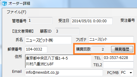 注文の詳細画面の左上に過去の購買回数の欄と[購買履歴]のボタンがあります。購買回数が0の時は購買履歴のボタンを押すことができません。